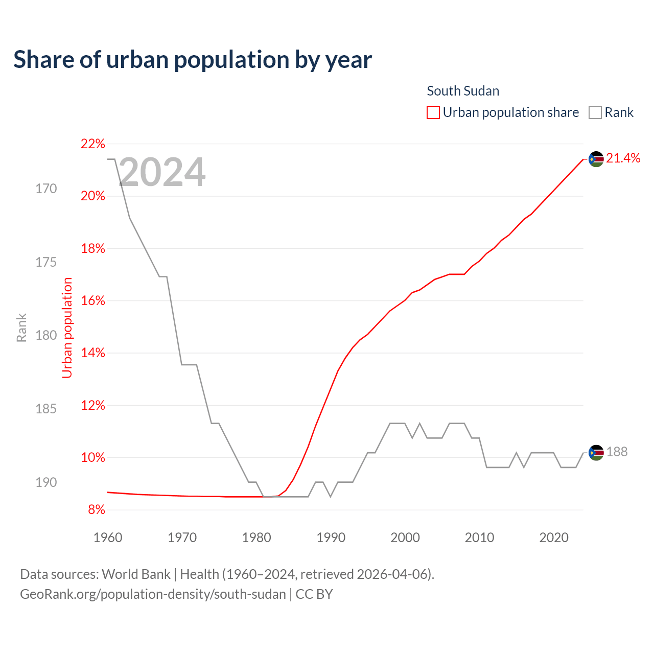 This chart shows the share of urban population in South Sudan from 1960 to 2024: 8.66% lived in urban areas in 1960, 16% in 2000, and 21.4% in 2024.