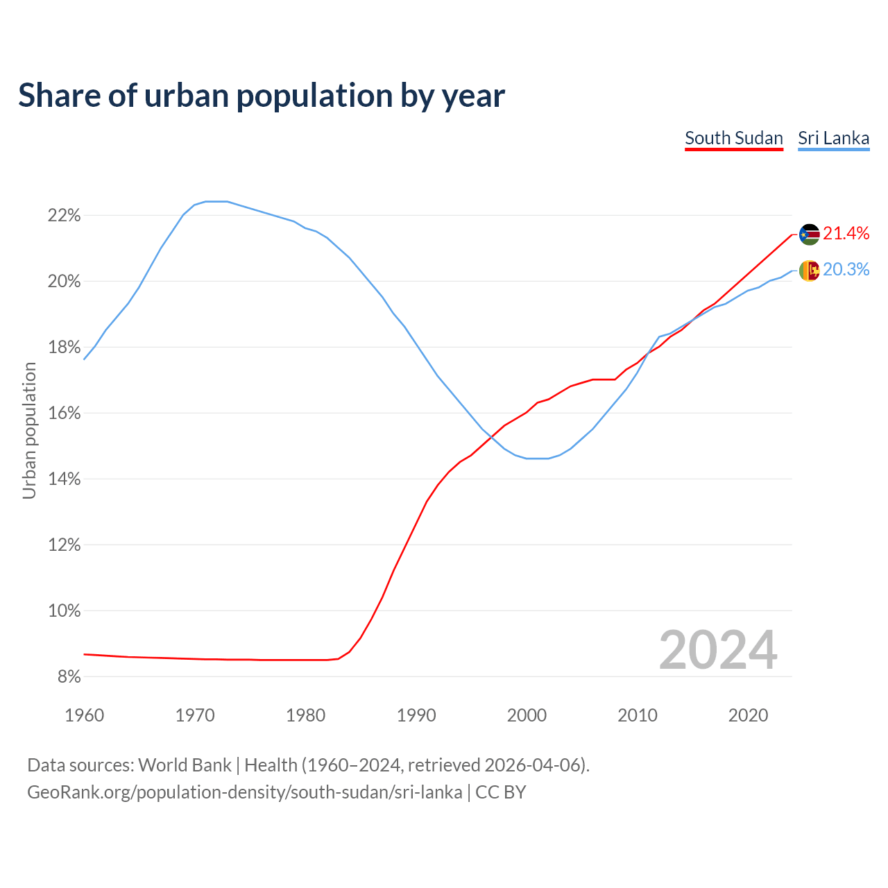 From 2004 to 2024, the share of urban population changed from 16.8% to 21.4% in South Sudan and from 14.9% to 20.3% in Sri Lanka.