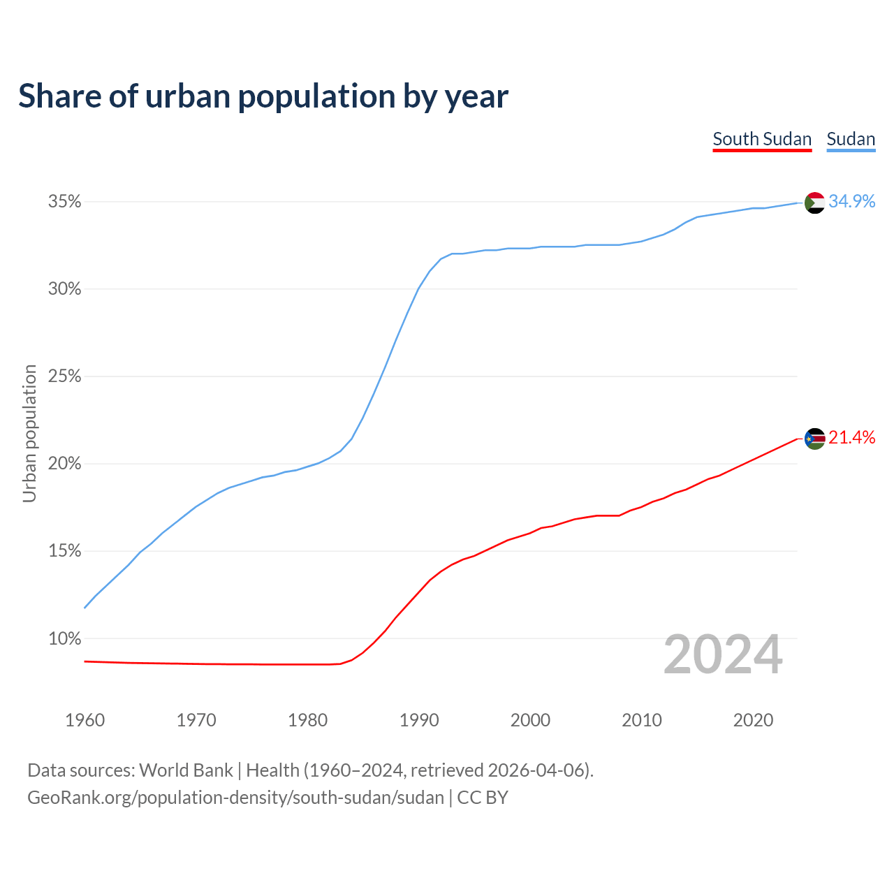 From 2004 to 2024, the share of urban population changed from 16.8% to 21.4% in South Sudan and from 32.4% to 34.9% in Sudan.