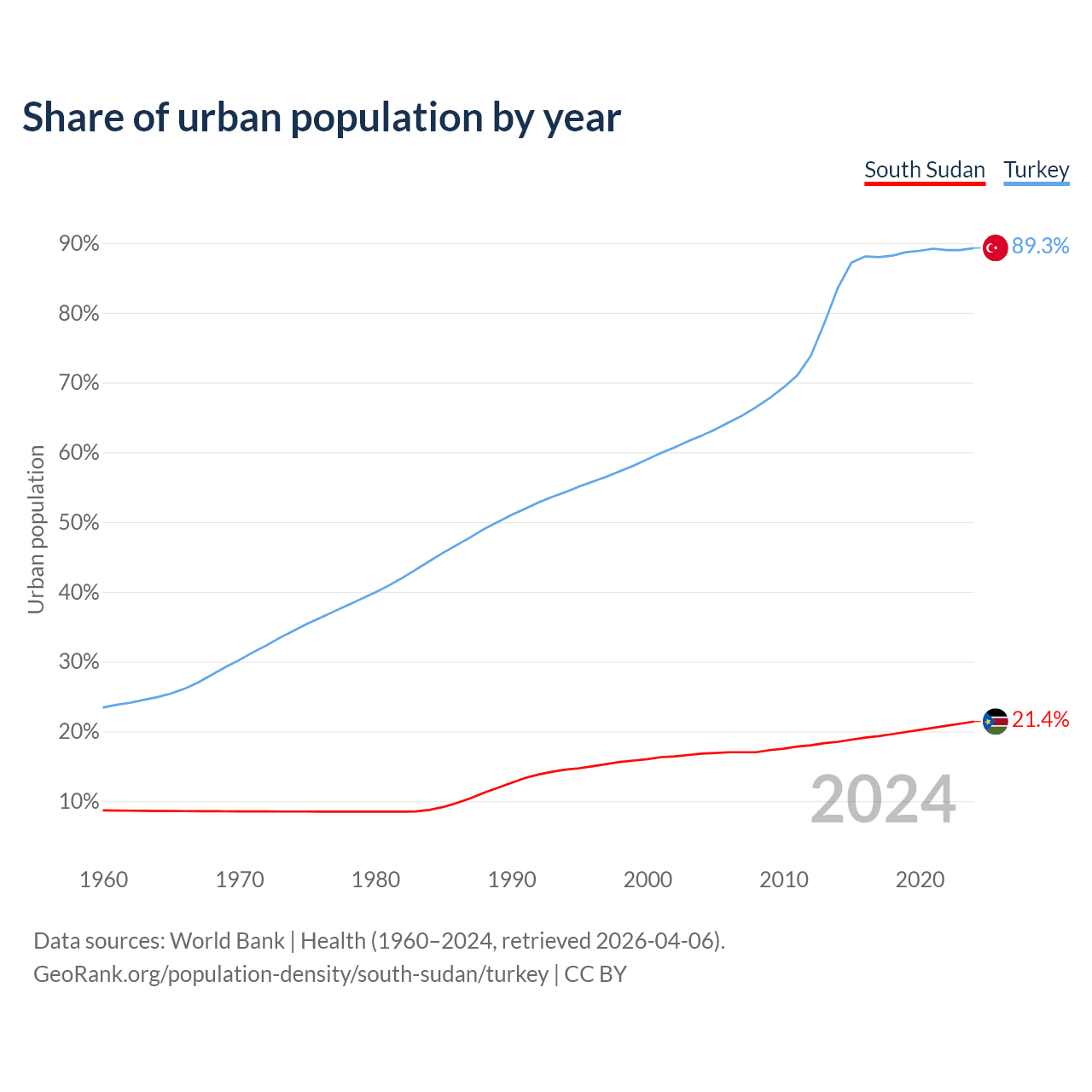 From 2004 to 2024, the share of urban population changed from 16.8% to 21.4% in South Sudan and from 62.4% to 89.3% in Turkey.