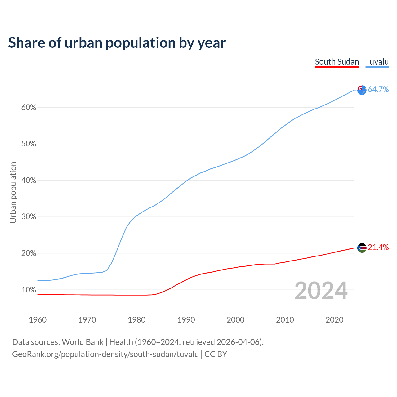 From 2004 to 2024, the share of urban population changed from 16.8% to 21.4% in South Sudan and from 48.4% to 64.7% in Tuvalu.