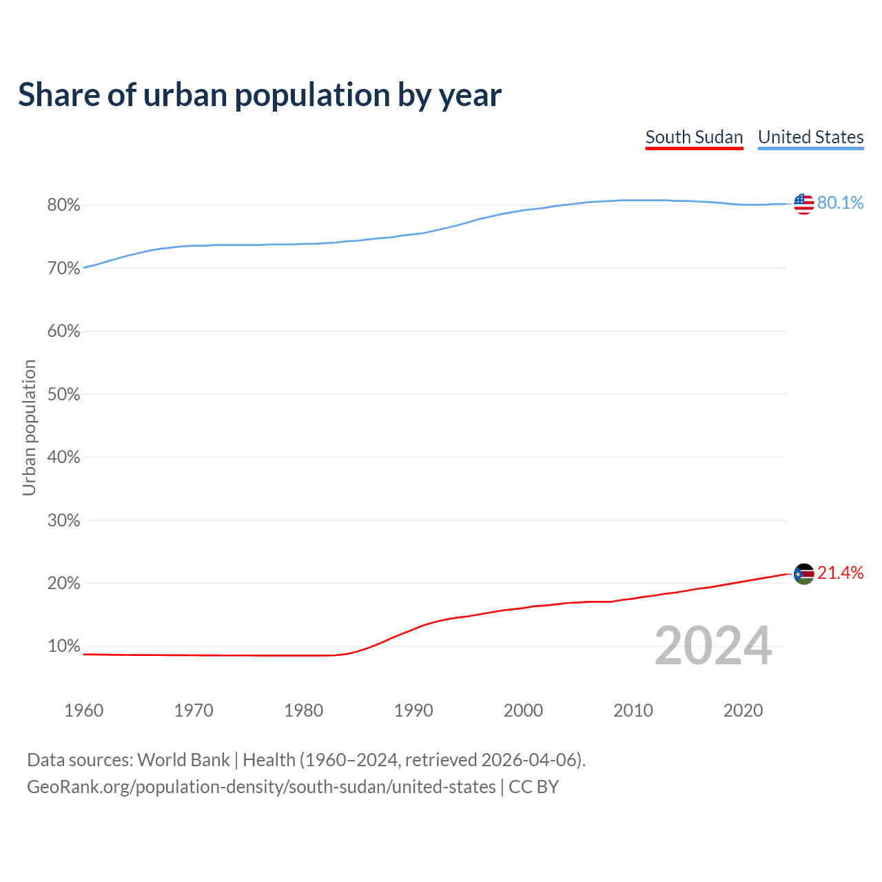 From 2004 to 2024, the share of urban population changed from 16.8% to 21.4% in South Sudan and from 80% to 80.1% in the United States.
