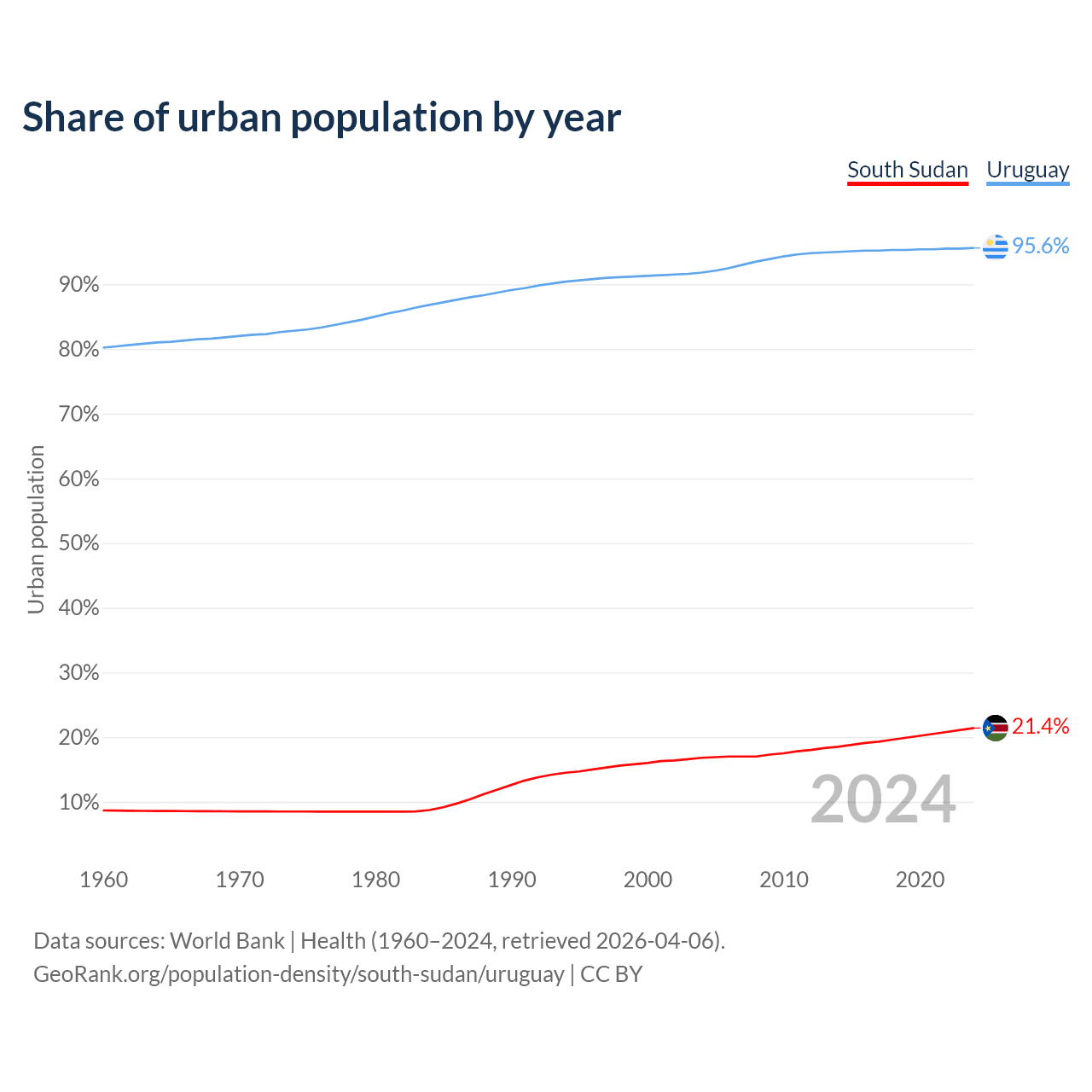 From 2004 to 2024, the share of urban population changed from 16.8% to 21.4% in South Sudan and from 91.8% to 95.6% in Uruguay.