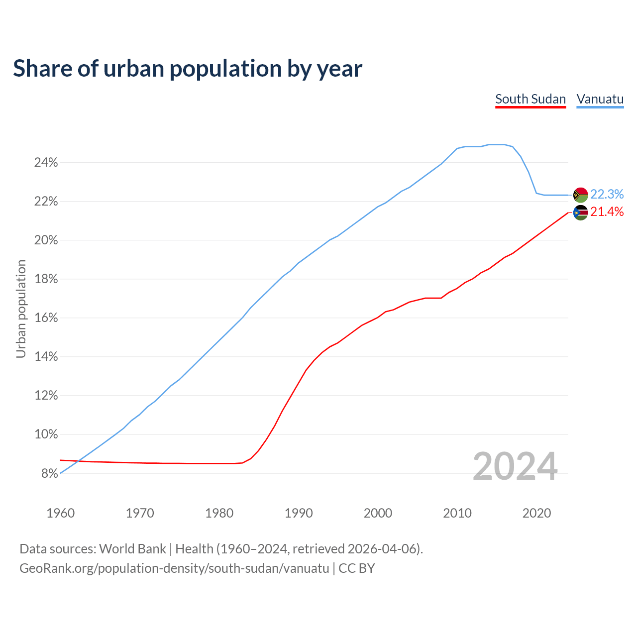 From 2004 to 2024, the share of urban population changed from 16.8% to 21.4% in South Sudan and from 22.7% to 22.3% in Vanuatu.