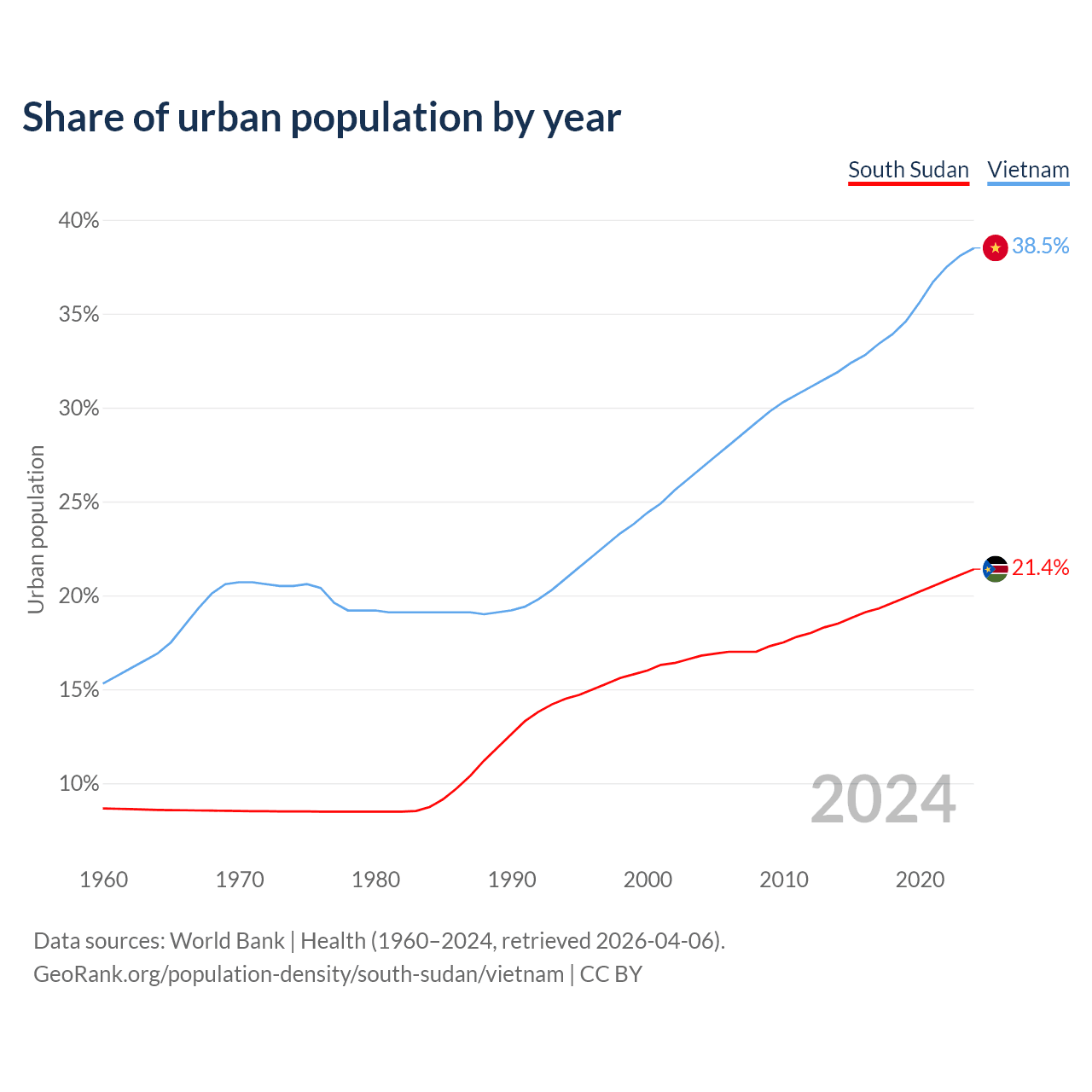 From 2004 to 2024, the share of urban population changed from 16.8% to 21.4% in South Sudan and from 26.8% to 38.5% in Vietnam.