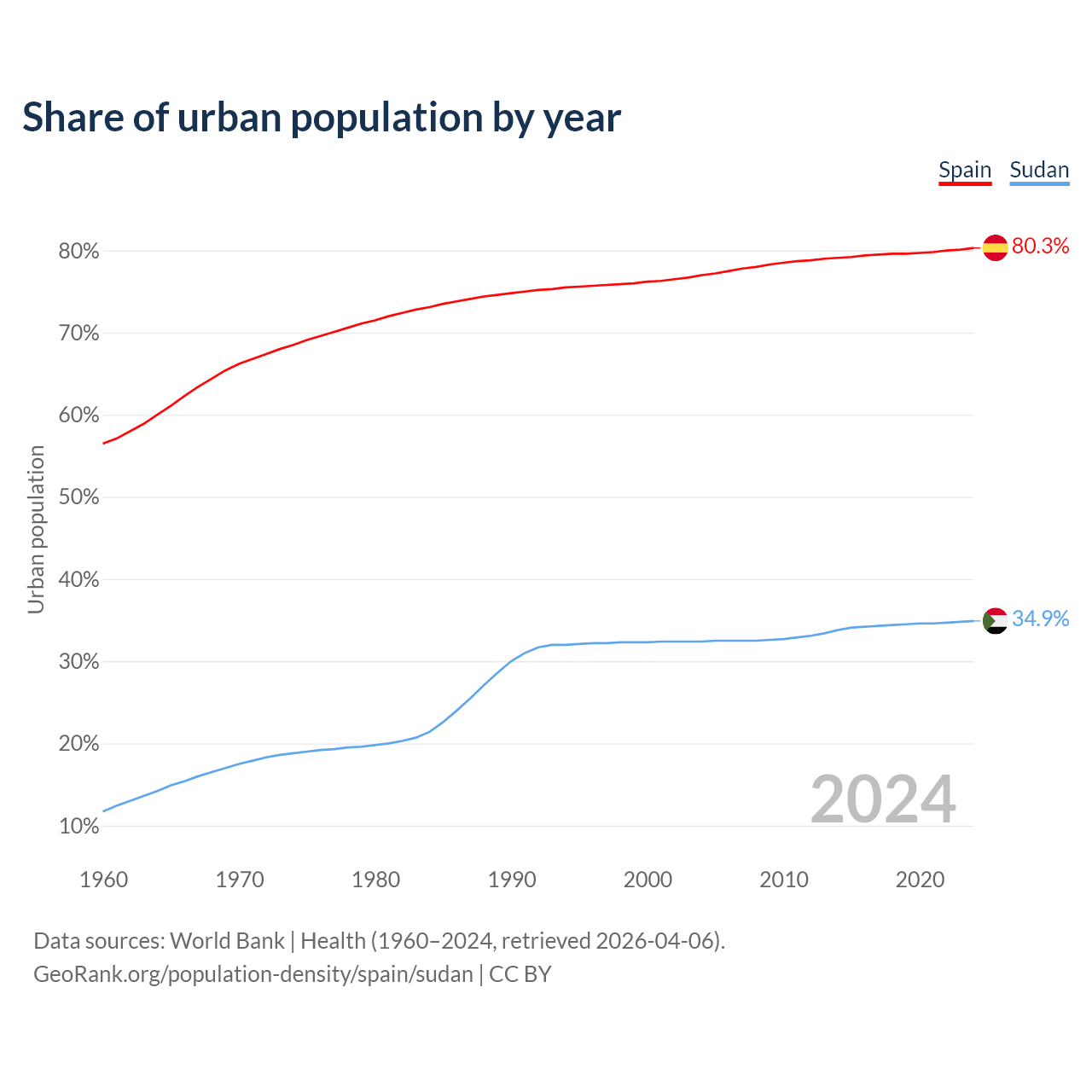 From 2004 to 2024, the share of urban population changed from 77% to 80.3% in Spain and from 32.4% to 34.9% in Sudan.