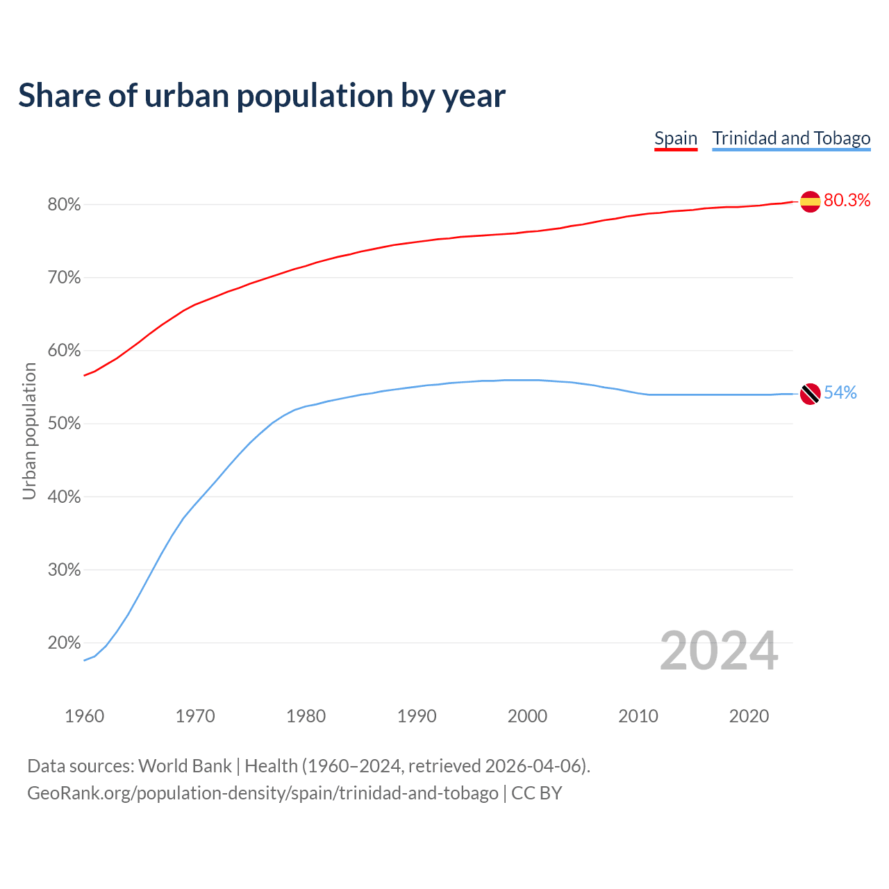 From 2004 to 2024, the share of urban population changed from 77% to 80.3% in Spain and from 55.6% to 54% in Trinidad and Tobago.