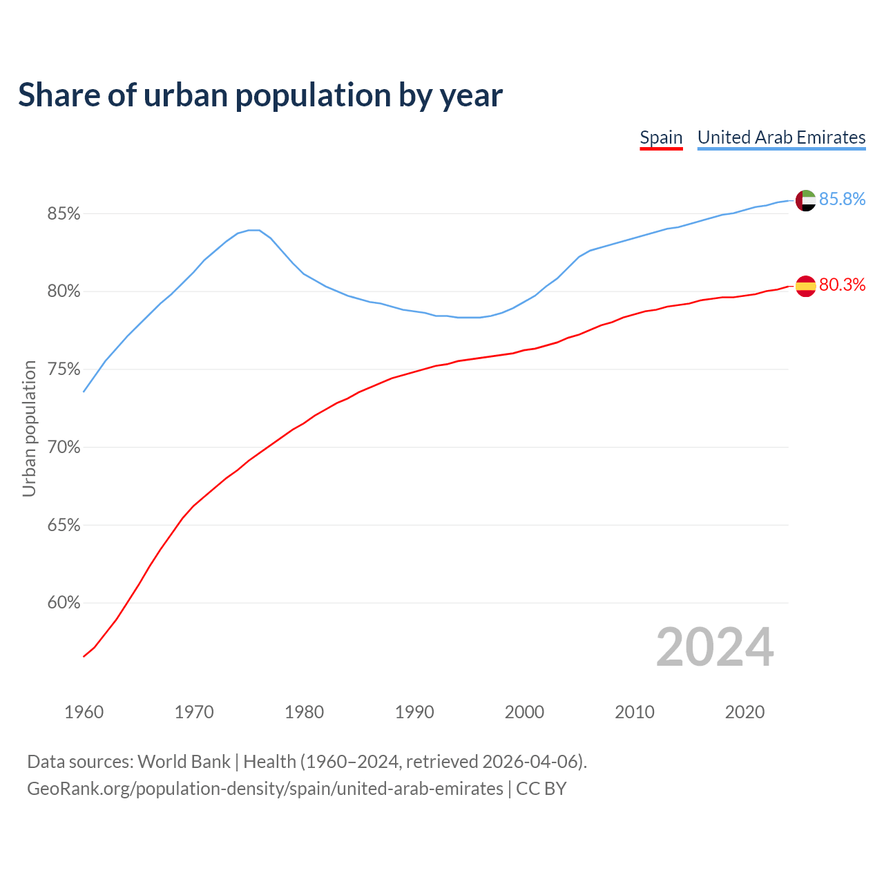 From 2004 to 2024, the share of urban population changed from 77% to 80.3% in Spain and from 81.5% to 85.8% in the United Arab Emirates.