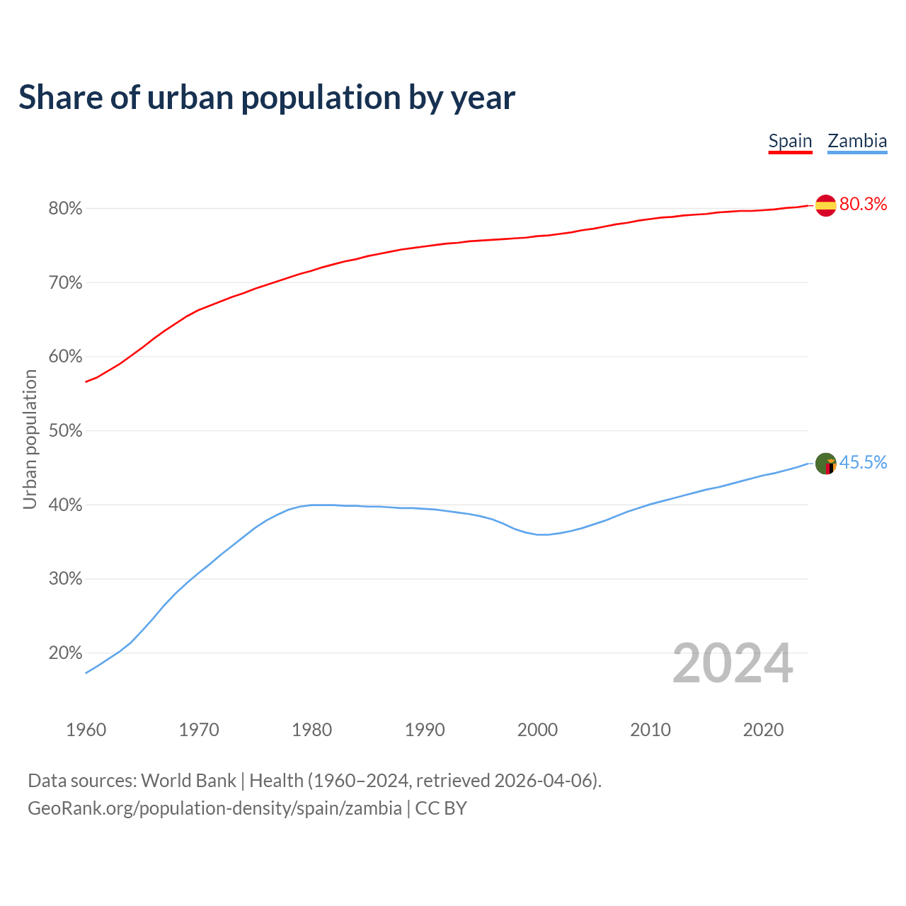 From 2004 to 2024, the share of urban population changed from 77% to 80.3% in Spain and from 36.8% to 45.5% in Zambia.