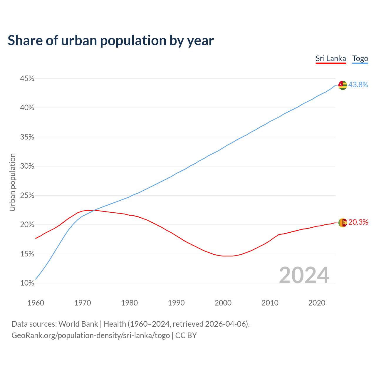From 2004 to 2024, the share of urban population changed from 14.9% to 20.3% in Sri Lanka and from 34.9% to 43.8% in Togo.
