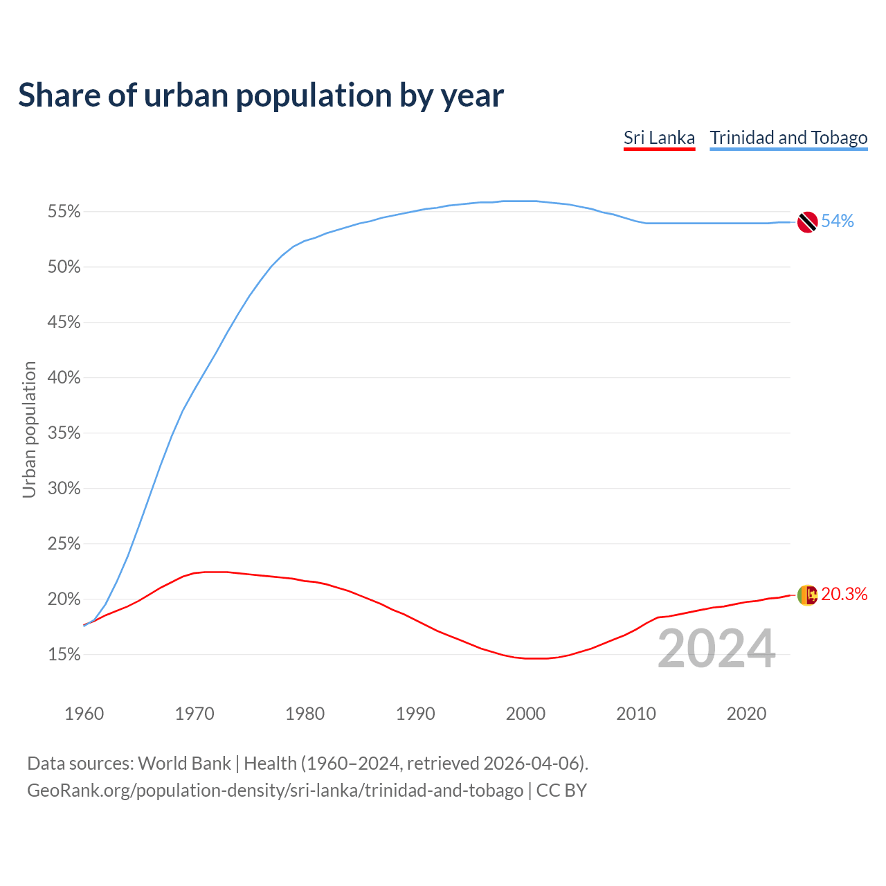 From 2004 to 2024, the share of urban population changed from 14.9% to 20.3% in Sri Lanka and from 55.6% to 54% in Trinidad and Tobago.