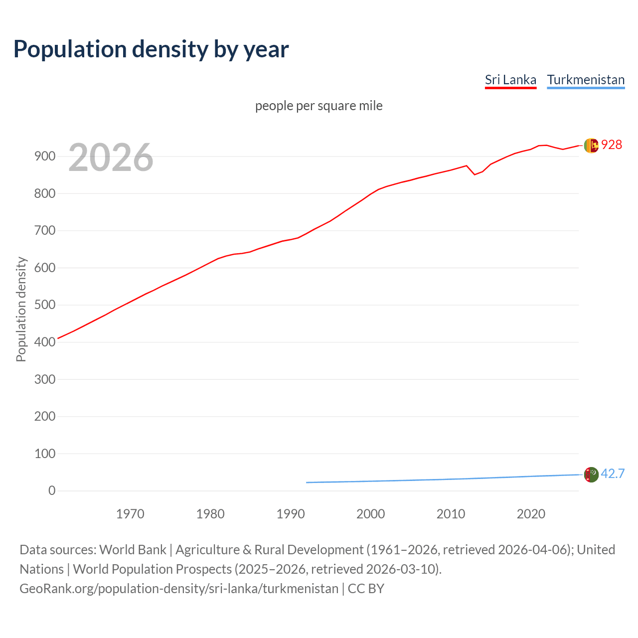 From 2006 to 2026, population density in Sri Lanka increased by 10.4%, compared to a 50.5% growth in Turkmenistan.