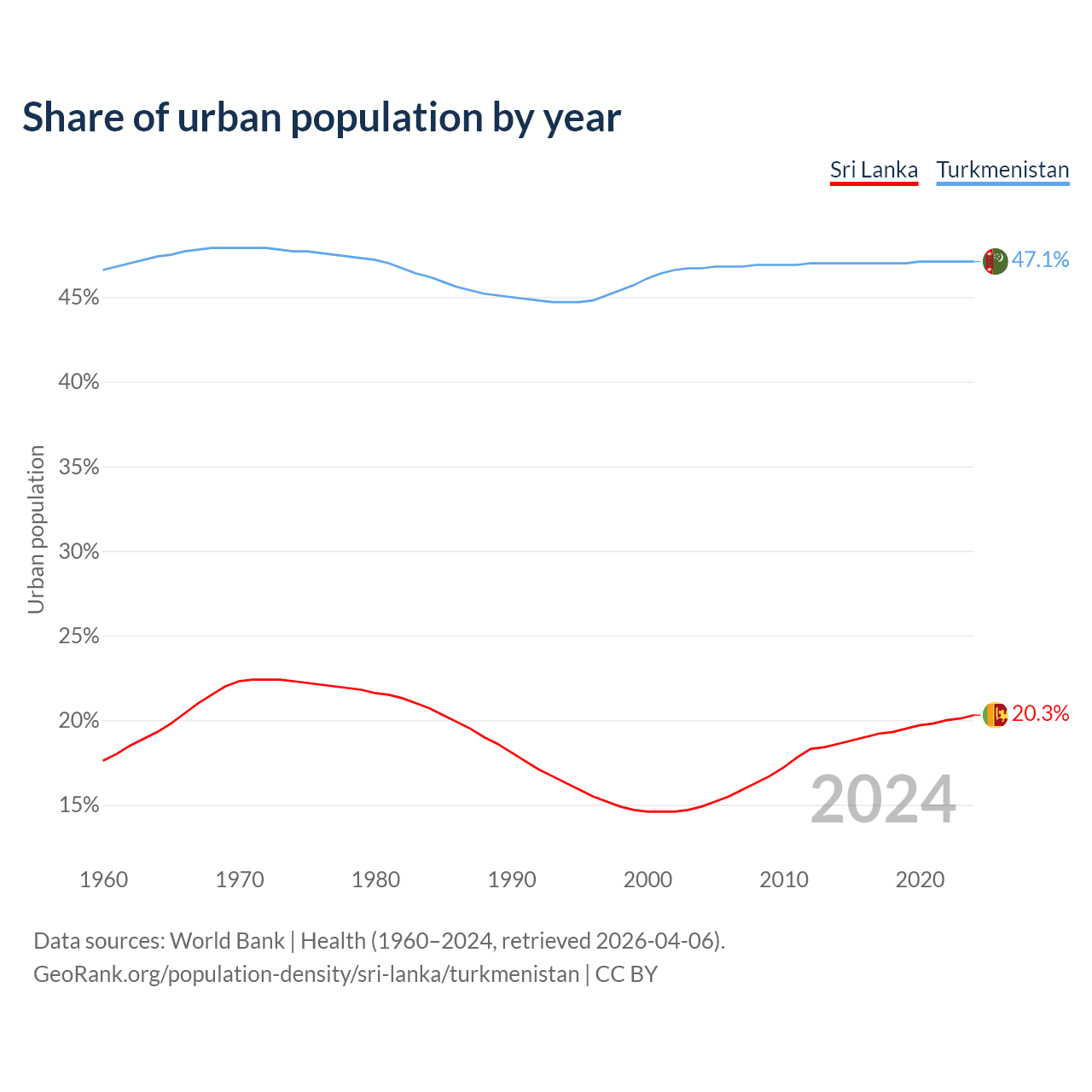 From 2004 to 2024, the share of urban population changed from 14.9% to 20.3% in Sri Lanka and from 46.7% to 47.1% in Turkmenistan.