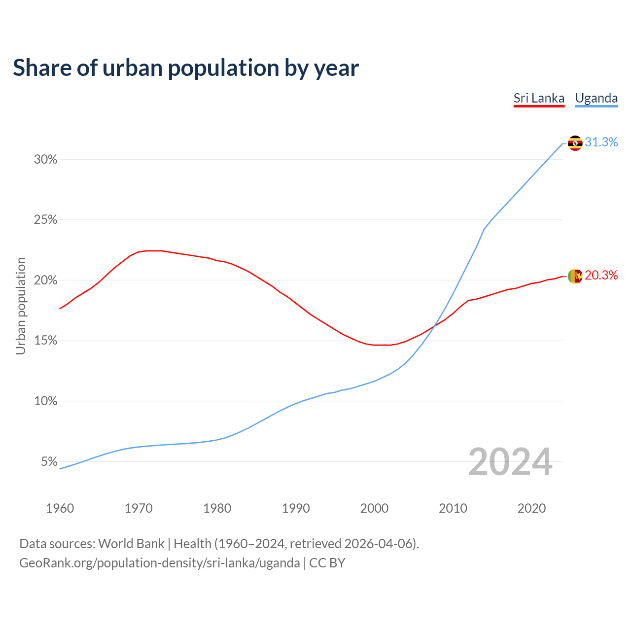 From 2004 to 2024, the share of urban population changed from 14.9% to 20.3% in Sri Lanka and from 13.1% to 31.3% in Uganda.