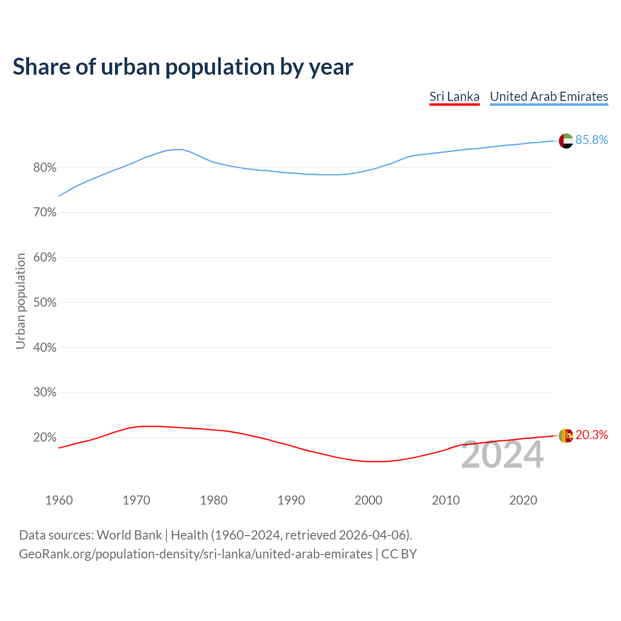 From 2004 to 2024, the share of urban population changed from 14.9% to 20.3% in Sri Lanka and from 81.5% to 85.8% in the United Arab Emirates.