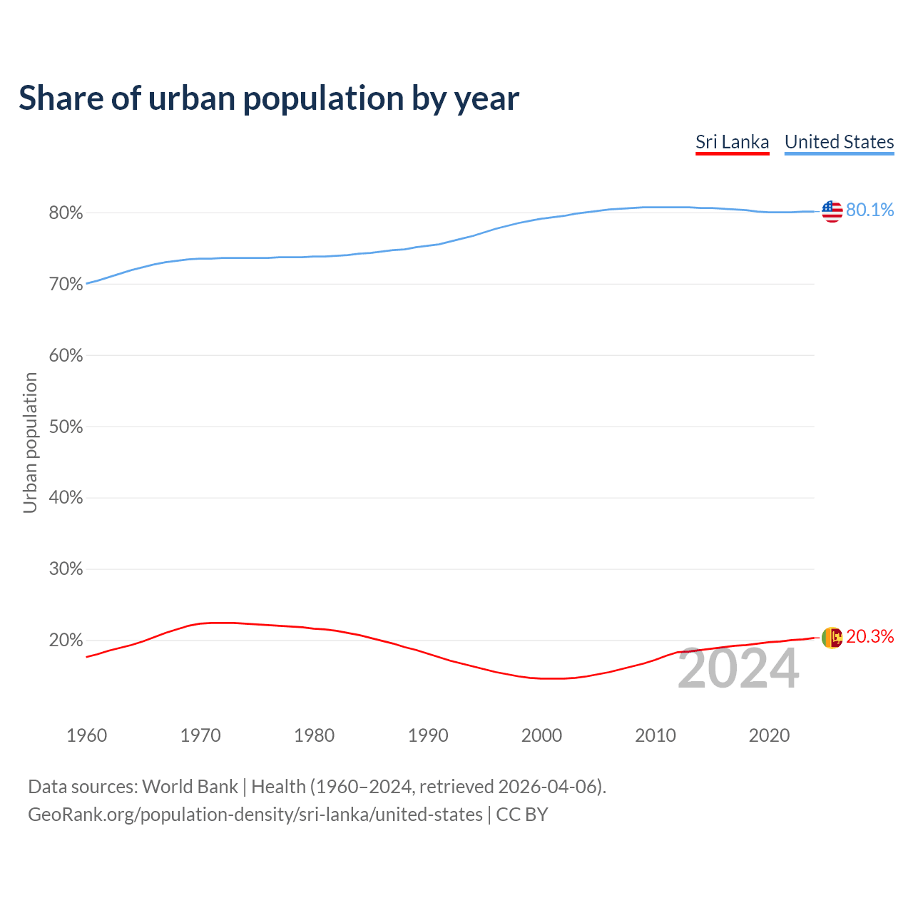 From 2004 to 2024, the share of urban population changed from 14.9% to 20.3% in Sri Lanka and from 80% to 80.1% in the United States.