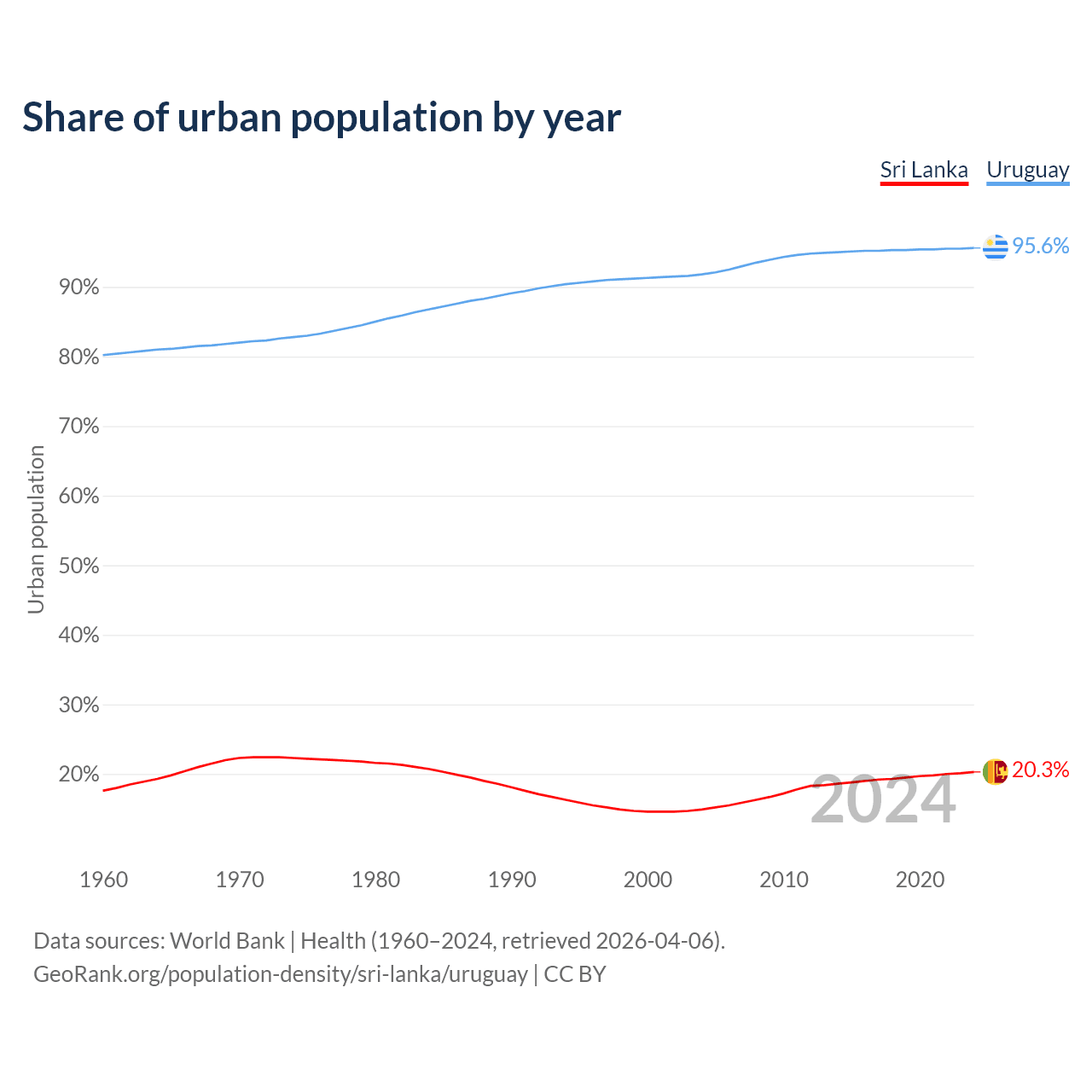 From 2004 to 2024, the share of urban population changed from 14.9% to 20.3% in Sri Lanka and from 91.8% to 95.6% in Uruguay.