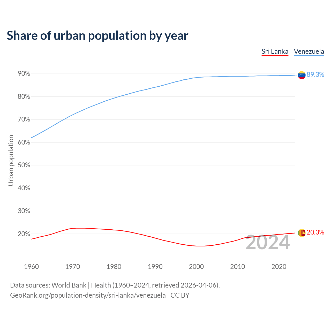 From 2004 to 2024, the share of urban population changed from 14.9% to 20.3% in Sri Lanka and from 88.6% to 89.3% in Venezuela.