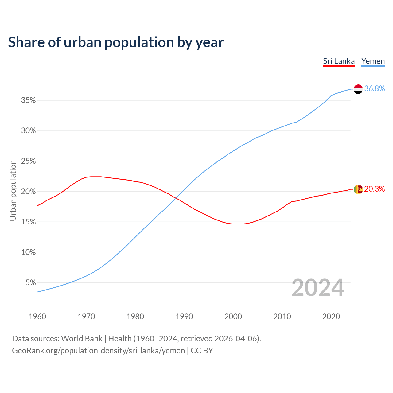 From 2004 to 2024, the share of urban population changed from 14.9% to 20.3% in Sri Lanka and from 28.5% to 36.8% in Yemen.