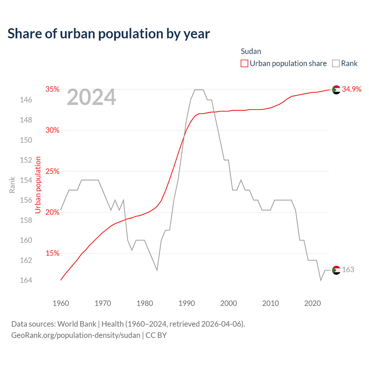 This chart shows the share of urban population in Sudan from 1960 to 2024: 11.7% lived in urban areas in 1960, 32.3% in 2000, and 34.9% in 2024.