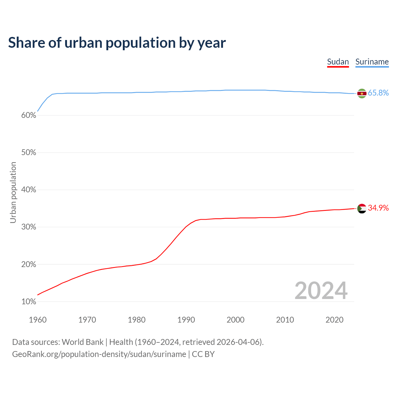 From 2004 to 2024, the share of urban population changed from 32.4% to 34.9% in Sudan and from 66.7% to 65.8% in Suriname.