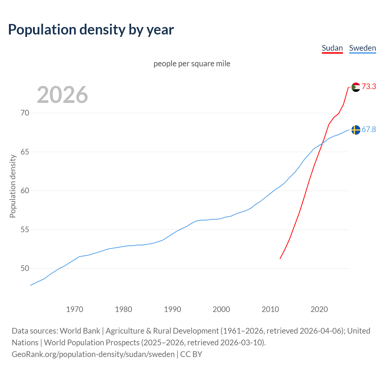 From 2012 to 2026, population density in Sudan increased by 43.3%, compared to a 12.1% growth in Sweden.