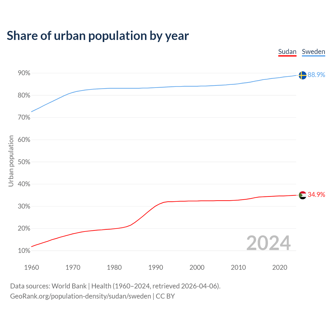 From 2004 to 2024, the share of urban population changed from 32.4% to 34.9% in Sudan and from 84.3% to 88.9% in Sweden.
