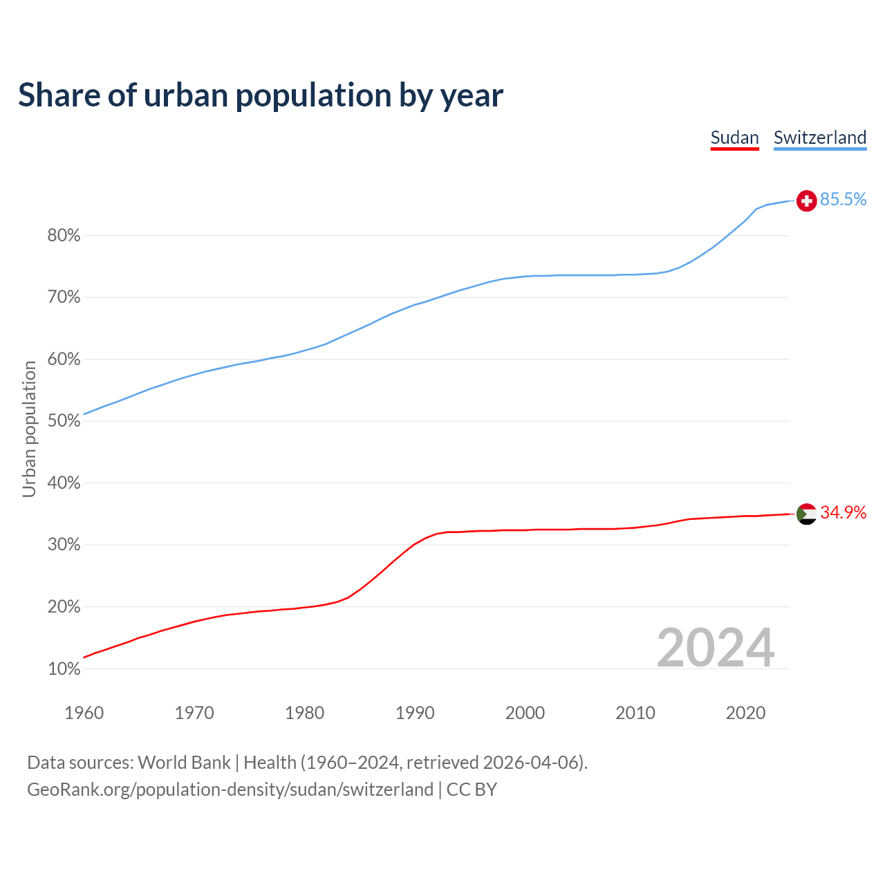 From 2004 to 2024, the share of urban population changed from 32.4% to 34.9% in Sudan and from 73.5% to 85.5% in Switzerland.