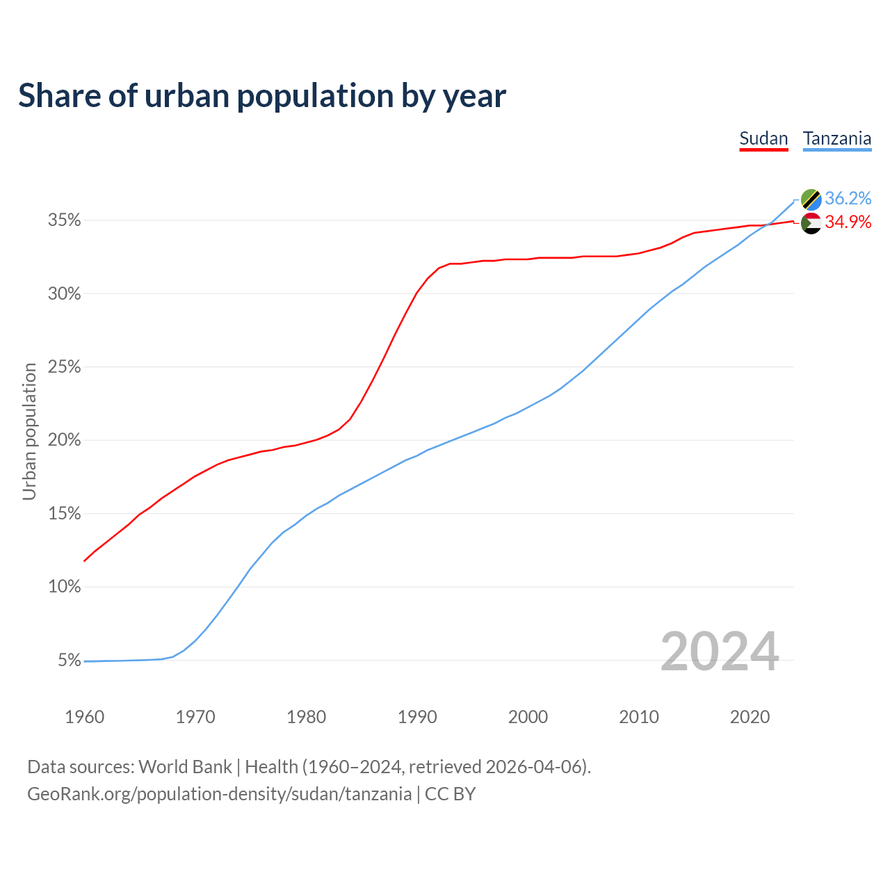 From 2004 to 2024, the share of urban population changed from 32.4% to 34.9% in Sudan and from 24.1% to 36.2% in Tanzania.