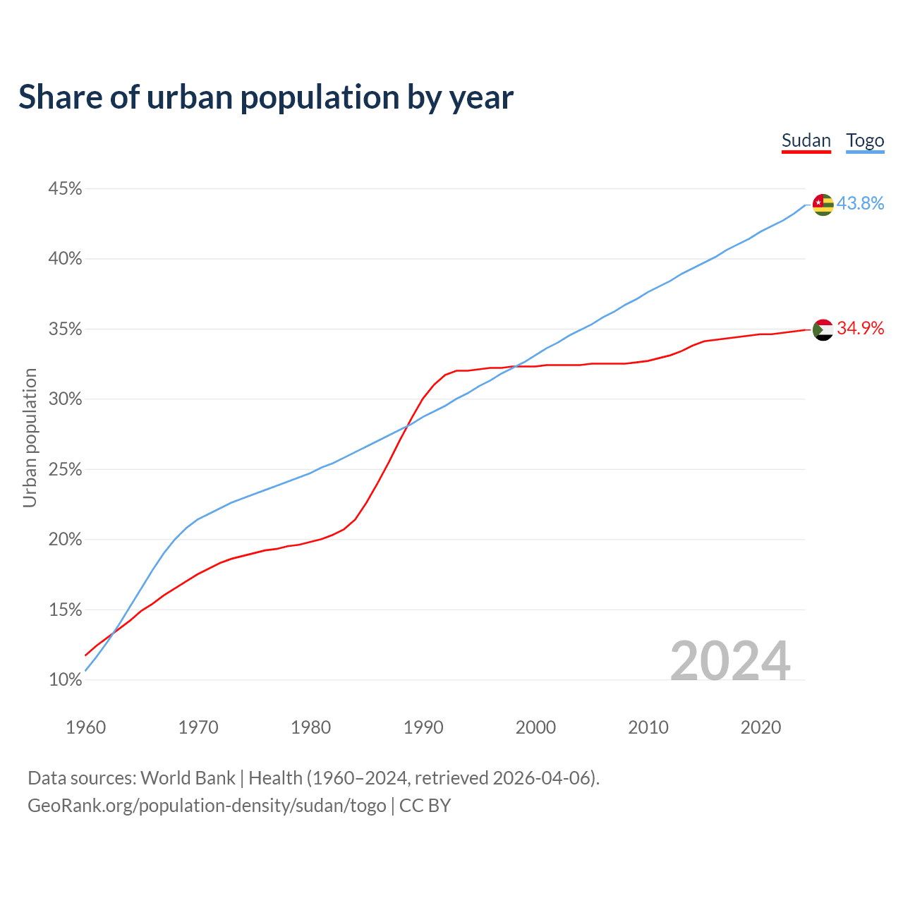 From 2004 to 2024, the share of urban population changed from 32.4% to 34.9% in Sudan and from 34.9% to 43.8% in Togo.