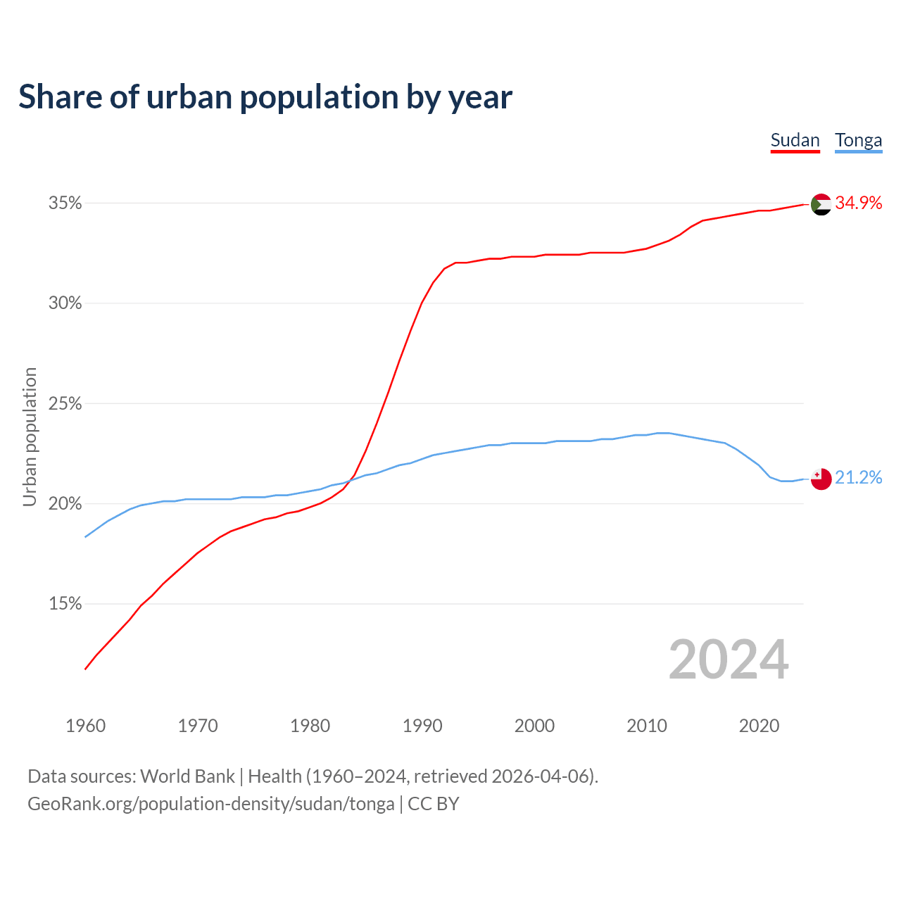 From 2004 to 2024, the share of urban population changed from 32.4% to 34.9% in Sudan and from 23.1% to 21.2% in Tonga.