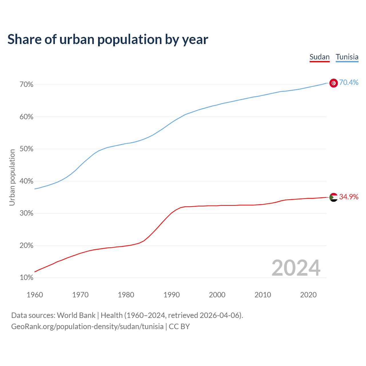 From 2004 to 2024, the share of urban population changed from 32.4% to 34.9% in Sudan and from 64.9% to 70.4% in Tunisia.