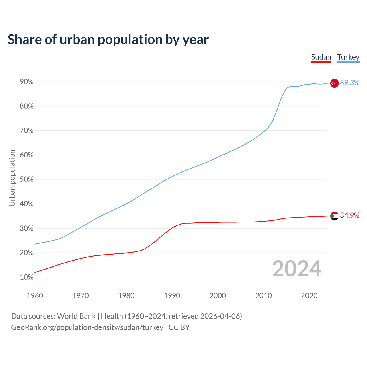 From 2004 to 2024, the share of urban population changed from 32.4% to 34.9% in Sudan and from 62.4% to 89.3% in Turkey.