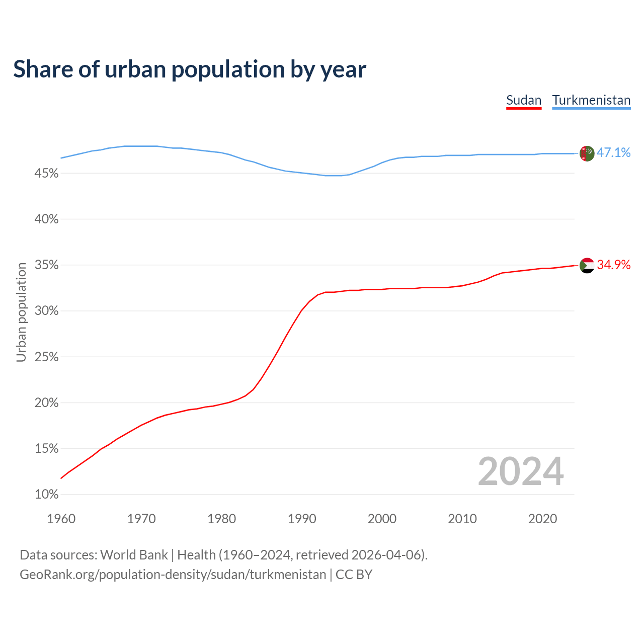 From 2004 to 2024, the share of urban population changed from 32.4% to 34.9% in Sudan and from 46.7% to 47.1% in Turkmenistan.