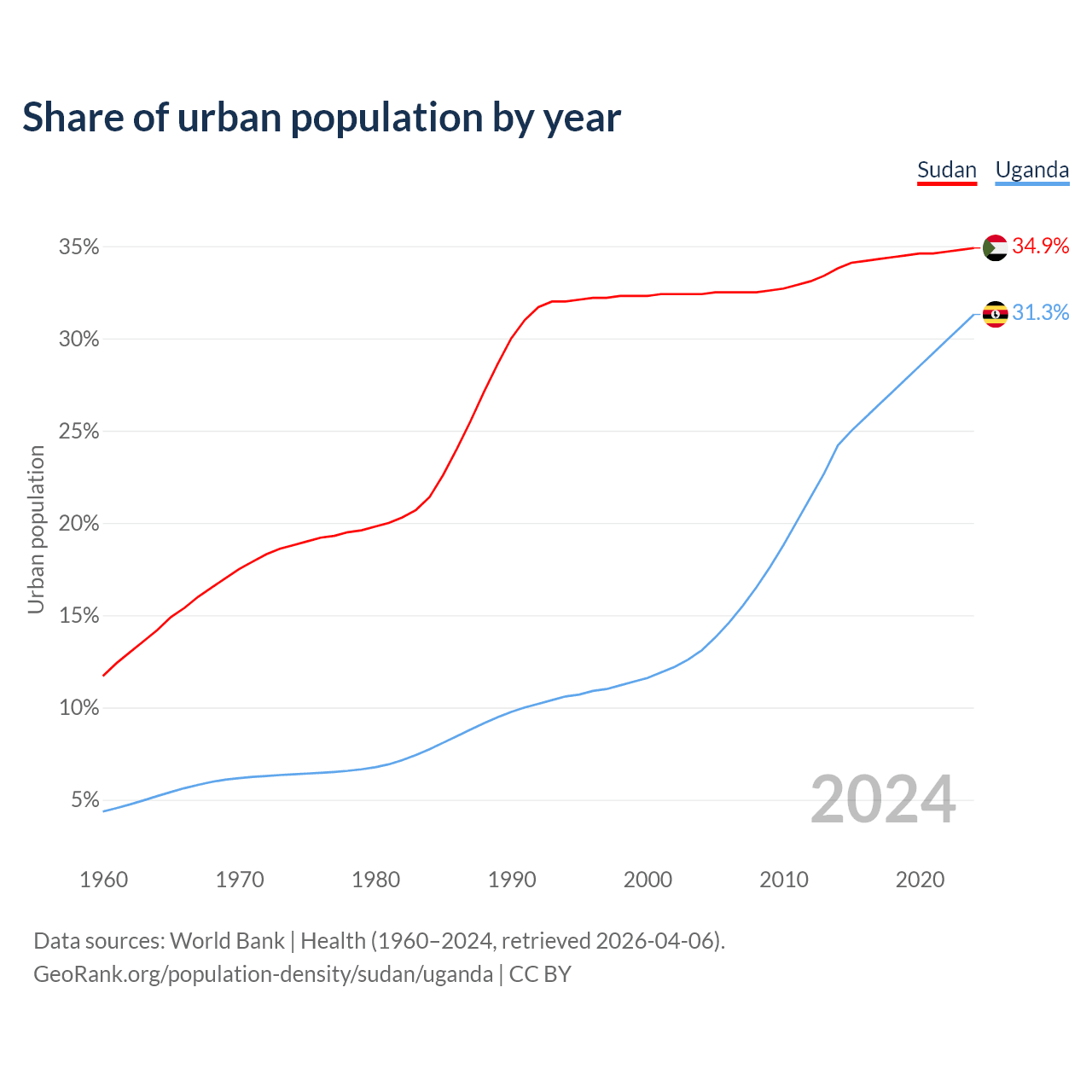 From 2004 to 2024, the share of urban population changed from 32.4% to 34.9% in Sudan and from 13.1% to 31.3% in Uganda.