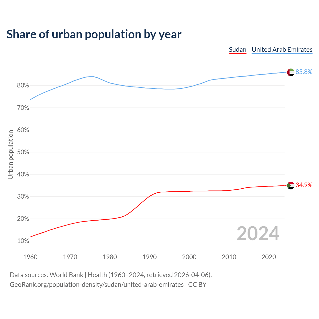 From 2004 to 2024, the share of urban population changed from 32.4% to 34.9% in Sudan and from 81.5% to 85.8% in the United Arab Emirates.