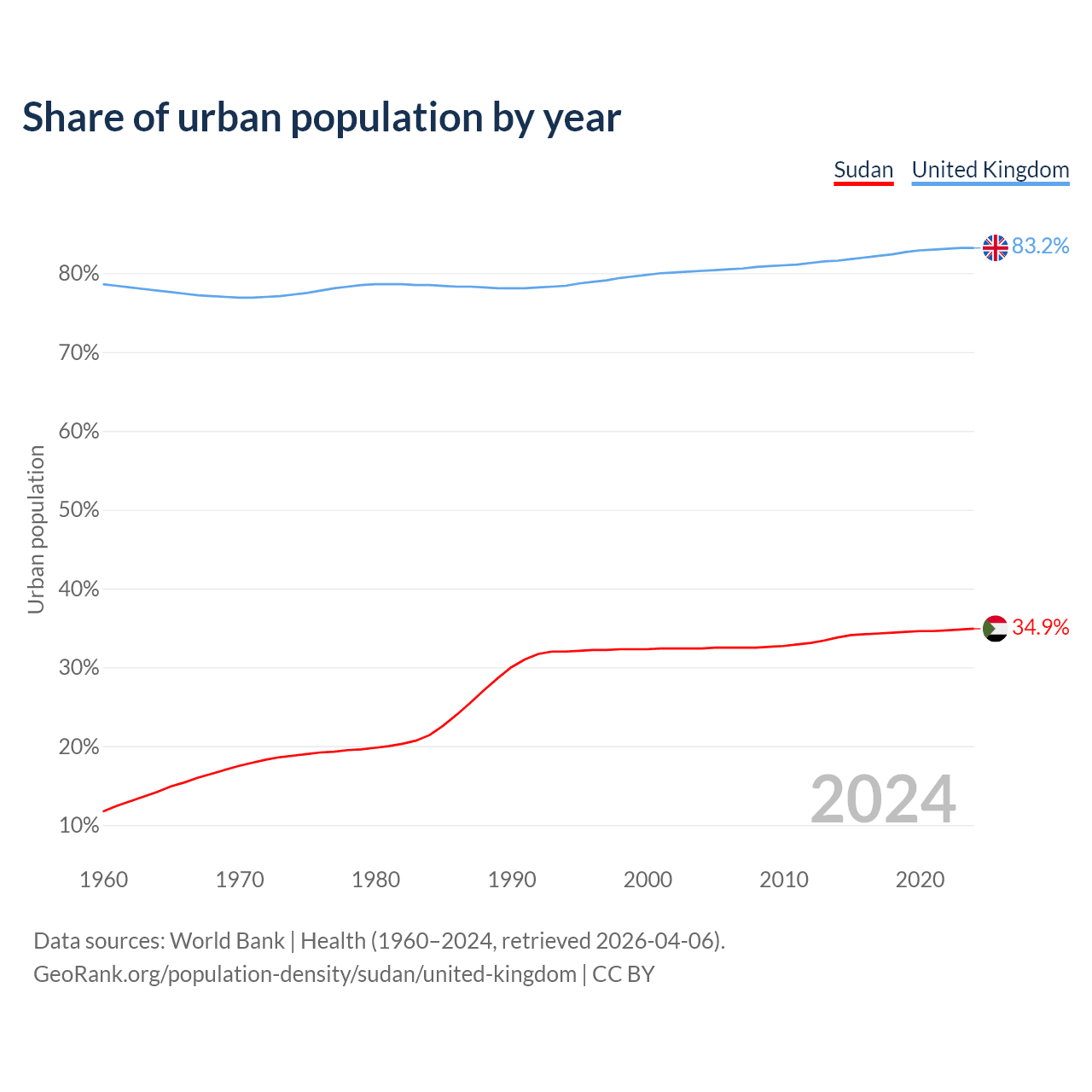 From 2004 to 2024, the share of urban population changed from 32.4% to 34.9% in Sudan and from 80.3% to 83.2% in the United Kingdom.