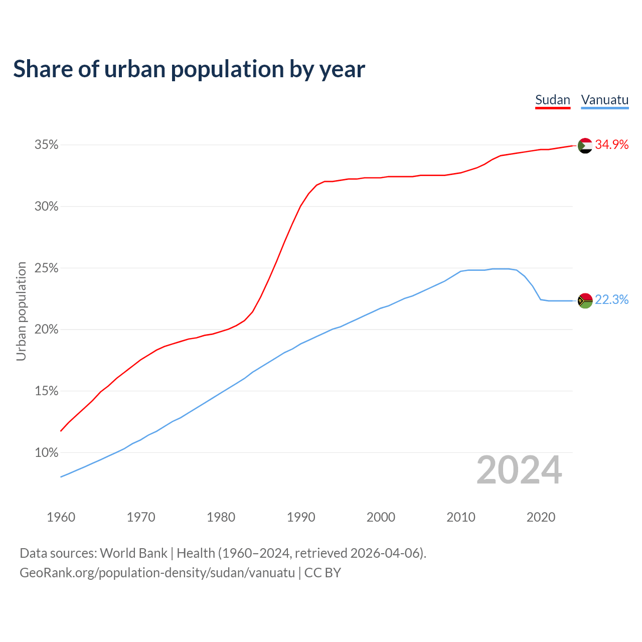 From 2004 to 2024, the share of urban population changed from 32.4% to 34.9% in Sudan and from 22.7% to 22.3% in Vanuatu.