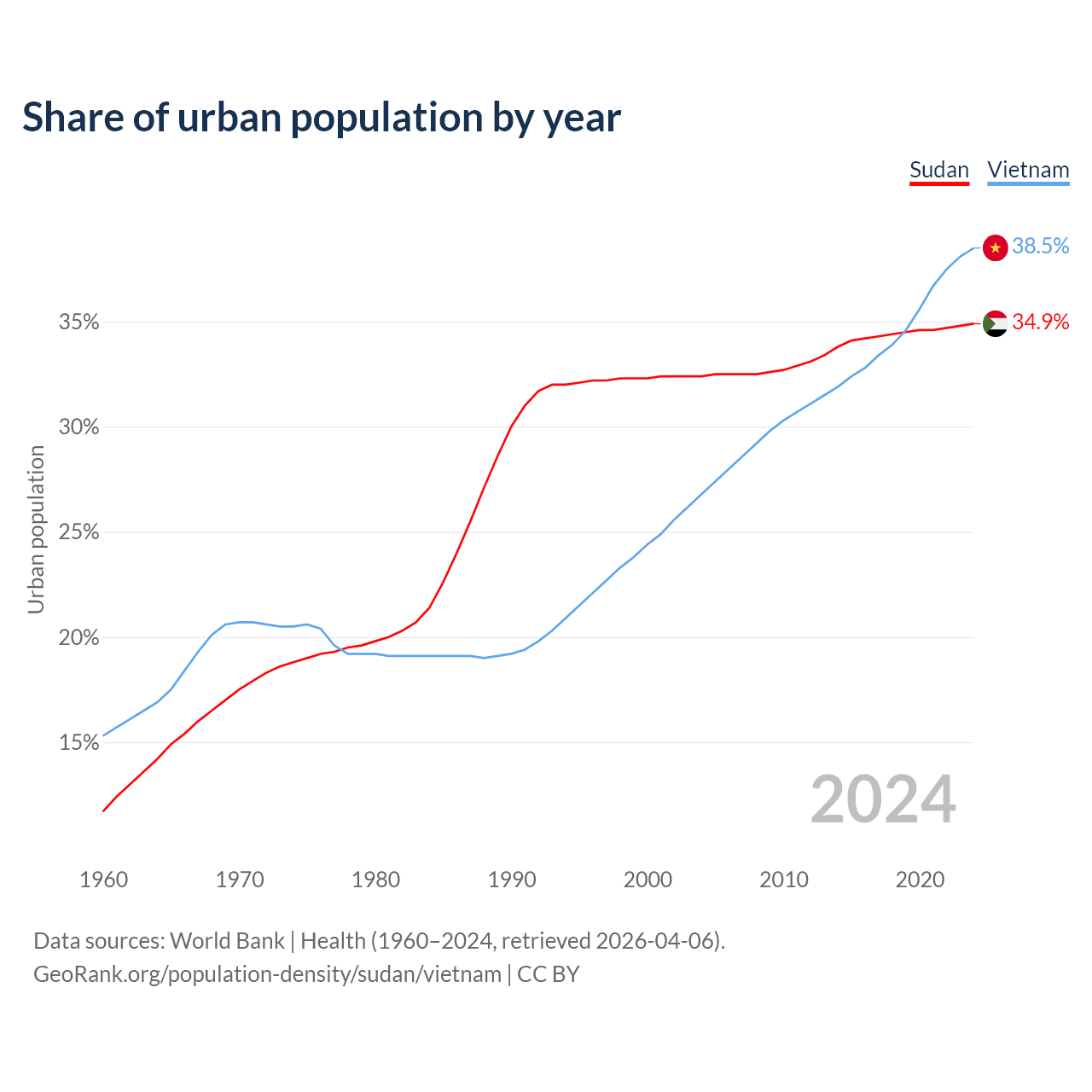 From 2004 to 2024, the share of urban population changed from 32.4% to 34.9% in Sudan and from 26.8% to 38.5% in Vietnam.