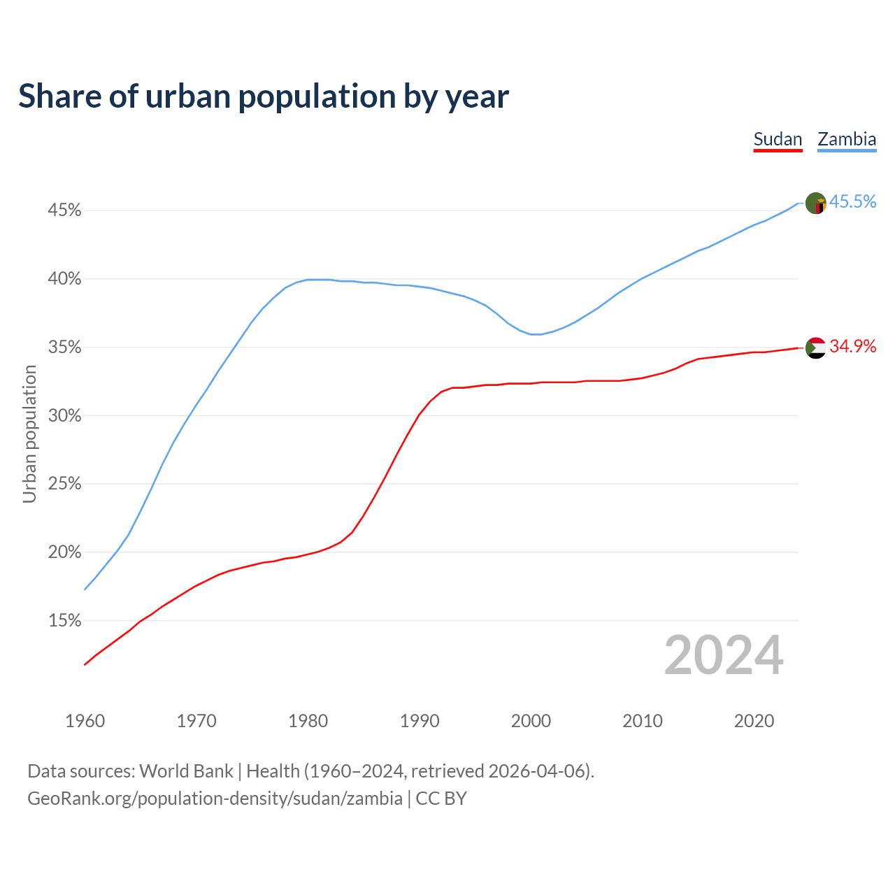 From 2004 to 2024, the share of urban population changed from 32.4% to 34.9% in Sudan and from 36.8% to 45.5% in Zambia.
