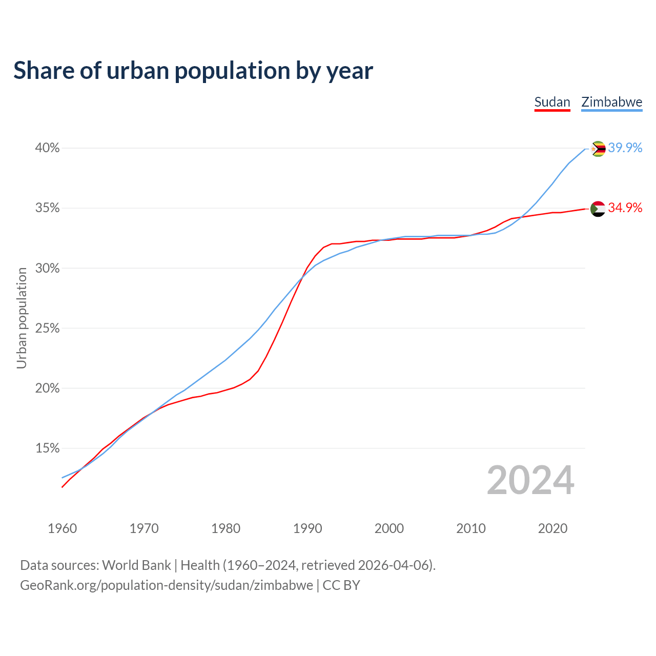 From 2004 to 2024, the share of urban population changed from 32.4% to 34.9% in Sudan and from 32.6% to 39.9% in Zimbabwe.