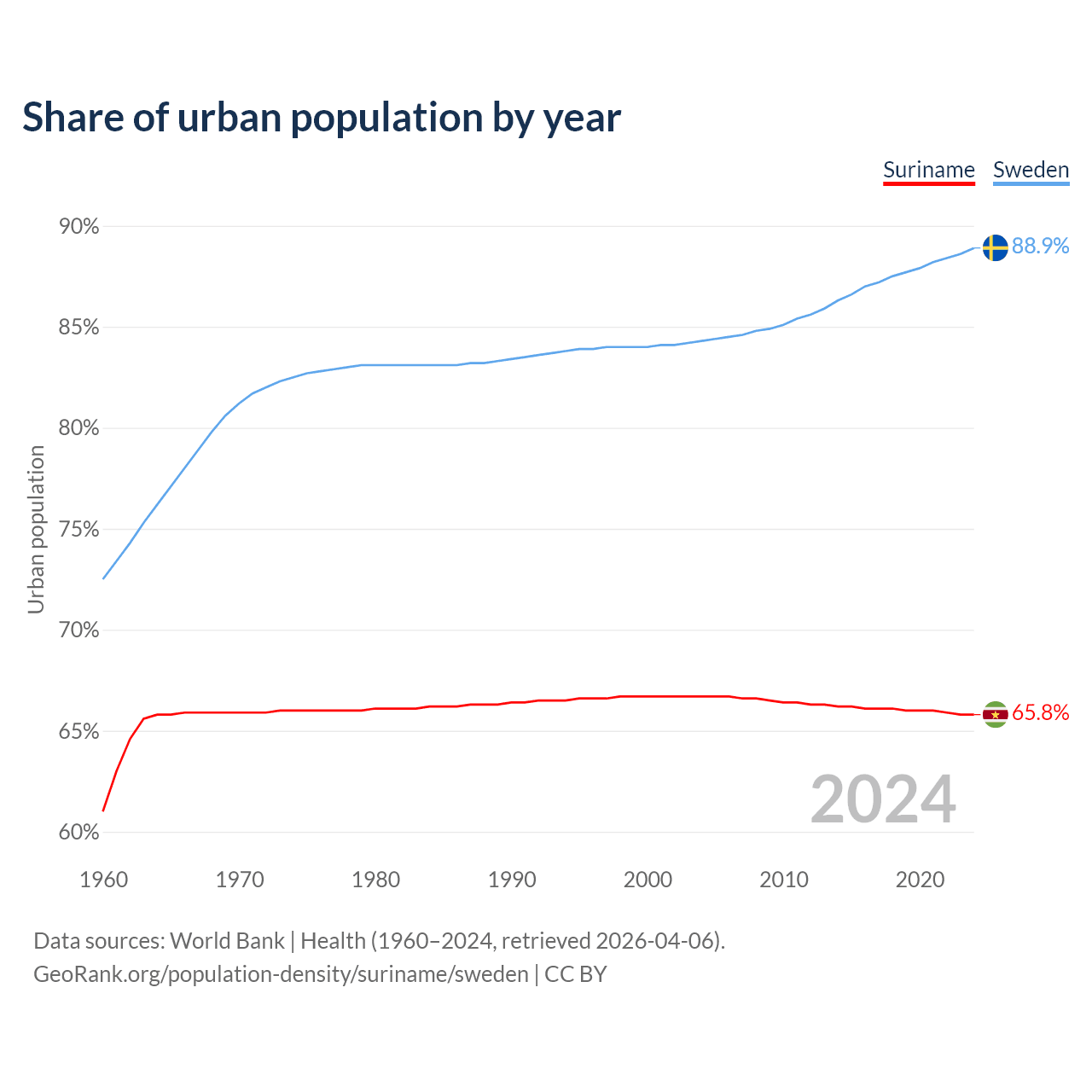 From 2004 to 2024, the share of urban population changed from 66.7% to 65.8% in Suriname and from 84.3% to 88.9% in Sweden.