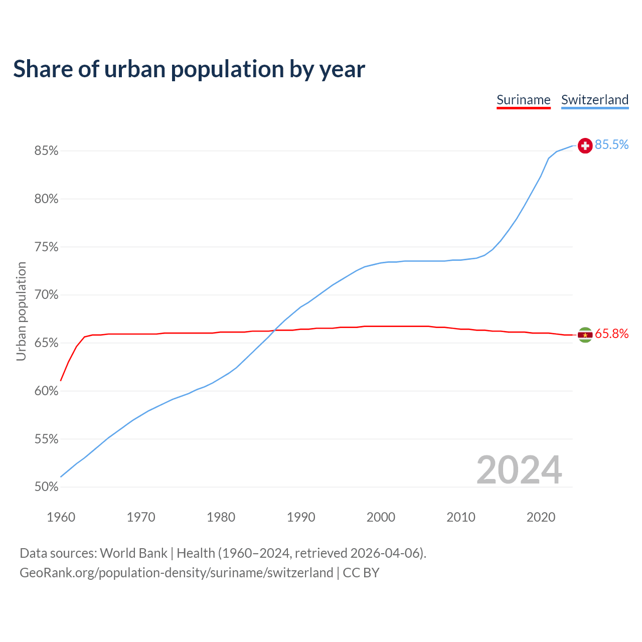 From 2004 to 2024, the share of urban population changed from 66.7% to 65.8% in Suriname and from 73.5% to 85.5% in Switzerland.