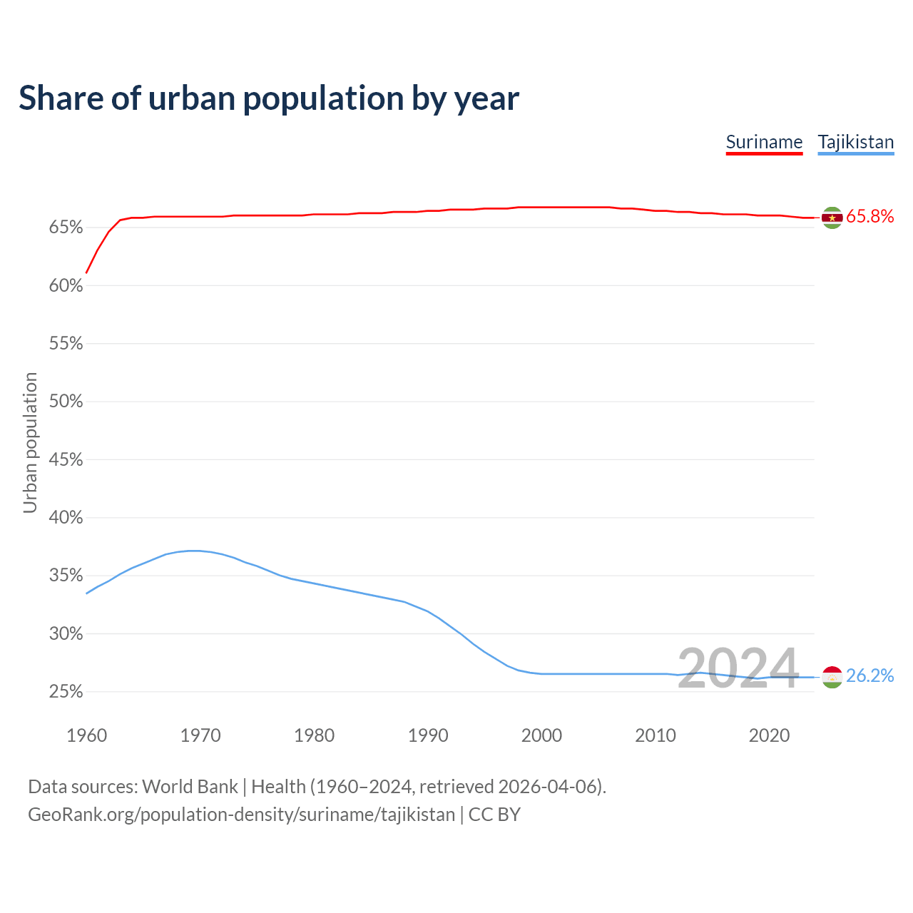 From 2004 to 2024, the share of urban population changed from 66.7% to 65.8% in Suriname and from 26.5% to 26.2% in Tajikistan.