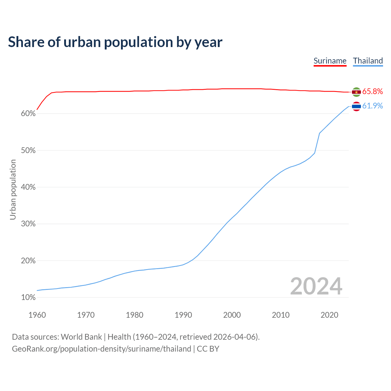From 2004 to 2024, the share of urban population changed from 66.7% to 65.8% in Suriname and from 36.8% to 61.9% in Thailand.