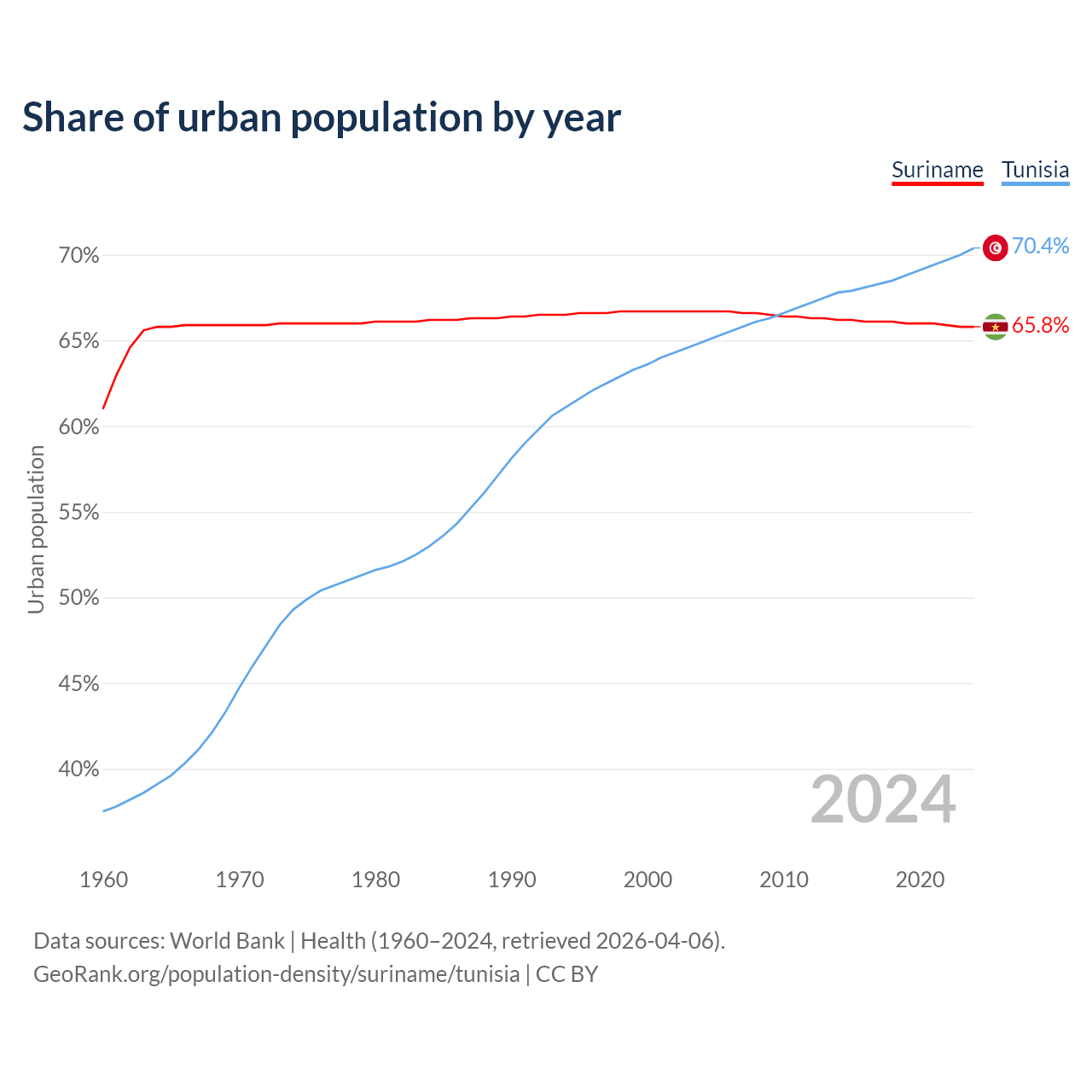 From 2004 to 2024, the share of urban population changed from 66.7% to 65.8% in Suriname and from 64.9% to 70.4% in Tunisia.