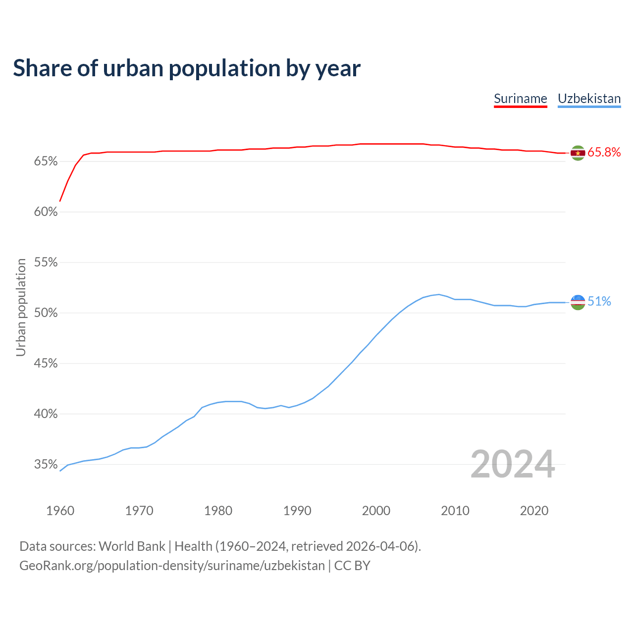 From 2004 to 2024, the share of urban population changed from 66.7% to 65.8% in Suriname and from 50.6% to 51% in Uzbekistan.