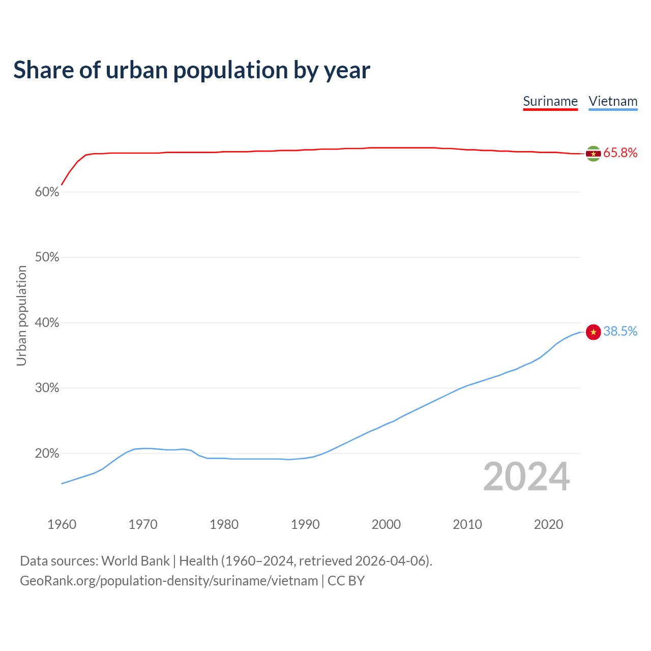 From 2004 to 2024, the share of urban population changed from 66.7% to 65.8% in Suriname and from 26.8% to 38.5% in Vietnam.