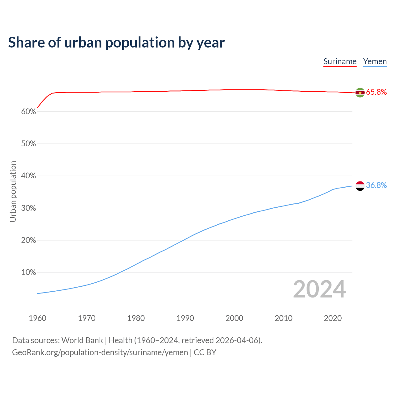 From 2004 to 2024, the share of urban population changed from 66.7% to 65.8% in Suriname and from 28.5% to 36.8% in Yemen.