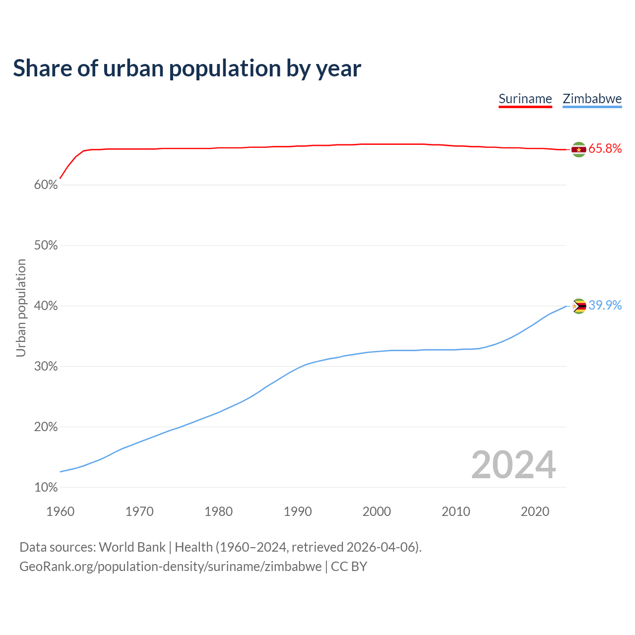 From 2004 to 2024, the share of urban population changed from 66.7% to 65.8% in Suriname and from 32.6% to 39.9% in Zimbabwe.